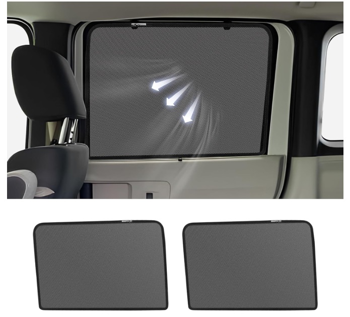 2. 車種専用サンシェード: 外からの視線を遮るプライバシー保護と、窓からの冷気・熱気を防ぐ断熱材の役割を果たします。N-BOX専用設計のものを選べば、隙間なくピッタリはまります。
